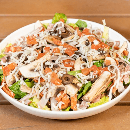 Green mix, lettuce, salami, Canadian bacon, pepperoni, tomatoes, mushrooms, black olives, onions, and mozzarella cheese