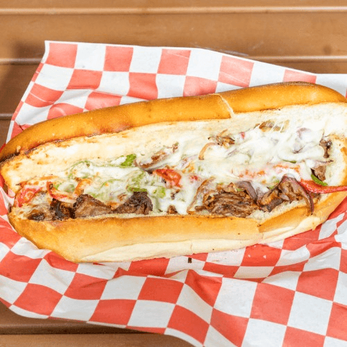 Green bell peppers, red onions, mushrooms, Philly steak, mayo, chipotle sauce, mozzarella cheese