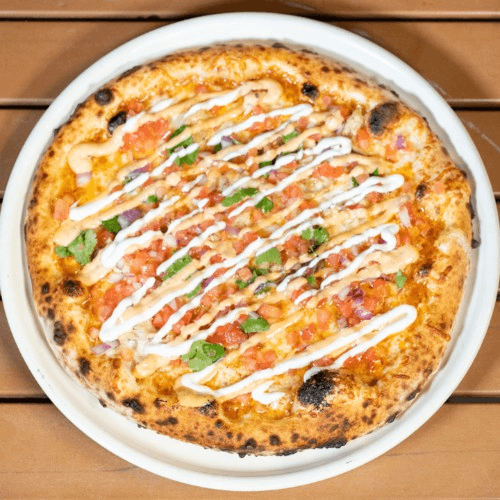 Smokey bbq sauce, shredded mozzarella, roasted chicken, bacon + ranch dressing
