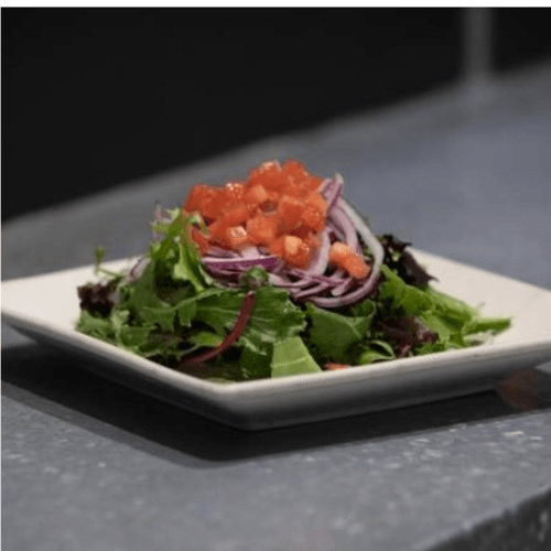 Mixed greens, tomatoes, red onions, shredded cheddar cheese, croutons, and choice of dressing
