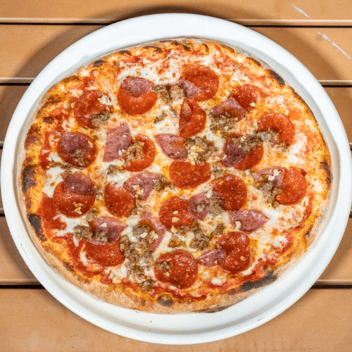 Marinara sauce, shredded mozzarella, salami, pepperoni, sausage, minced garlic